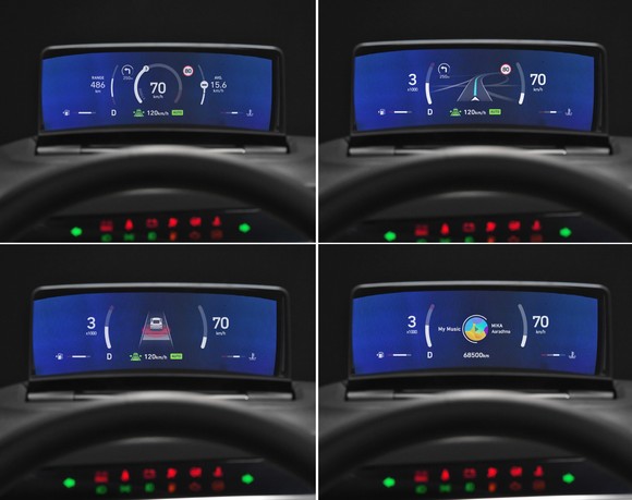 또 클러스터리스 HUD는 상단의 세 구역과 하단의 한 구역 총 4개의 표시영역으로 구성돼 있다. 상단에는 △속도 △RPM △ADAS 관련 정보 △길안내 정보 등을 보여주며, 하단에서는 △변속 모드 △냉각수 온도 △주행가능거리 등 차량의 기본 정보를 볼 수 있다. 방향 지시등 및 시스템 정보 경고등도 표시할 수 있다.
