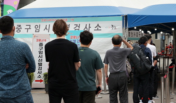 2일 서울역 앞 코로나19 선별검사소에 검사를 받기 위해 대기해 있다. © 연합뉴스