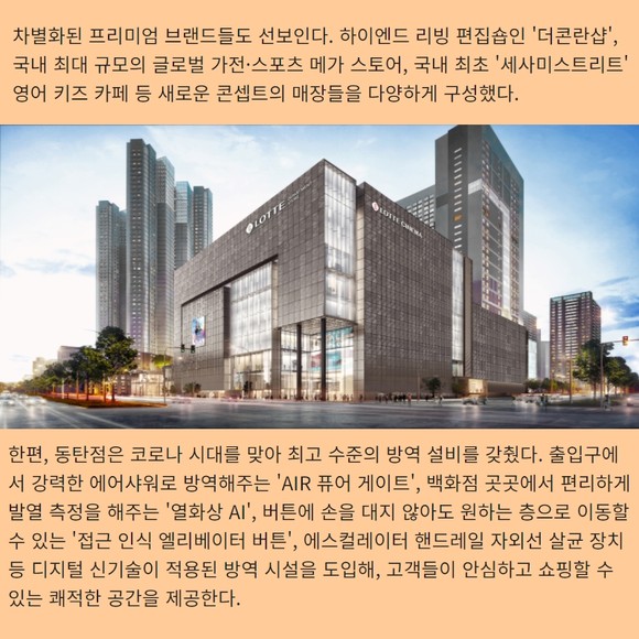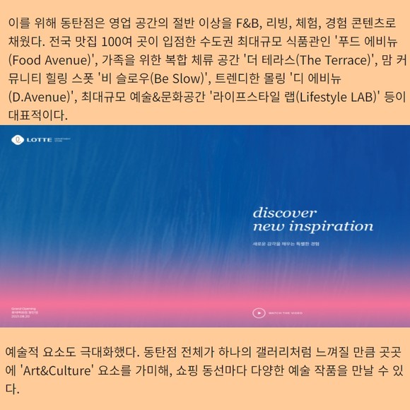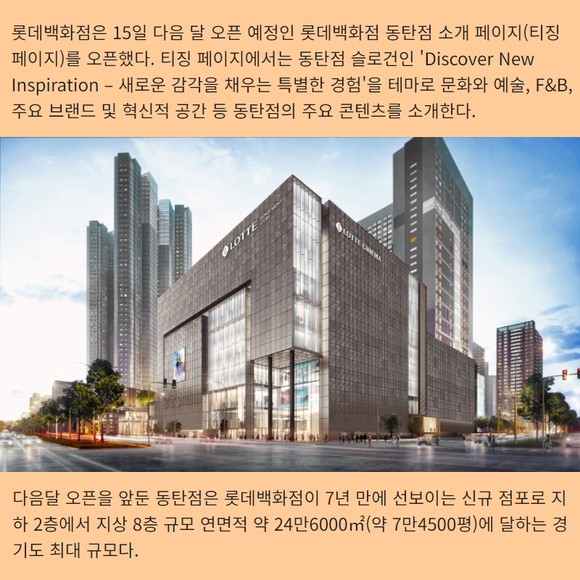 [프라임경제] 롯데백화점은 15일 다음 달 오픈 예정인 롯데백화점 동탄점 소개 페이지(티징 페이지)를 오픈했다. 티징 페이지에서는 동탄점 슬로건인 'Discover New Inspiration – 새로운 감각을 채우는 특별한 경험'을 테마로 문화와 예술, F&B, 주요 브랜드 및 혁신적 공간 등 동탄점의 주요 콘텐츠를 소개한다.