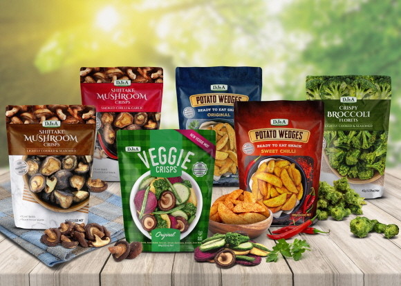 'DJ&A'는 저온 가공 공법을 사용한 원물 함량 75%이상의 순수 야채 스낵으로, 화학 첨가물을 사용하지 않고 할랄 인증을 받은 친환경 기업의 대표 비건 상품이다.
