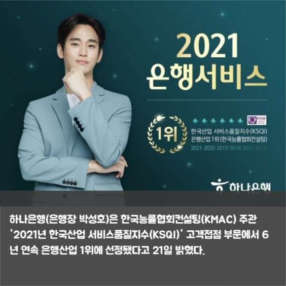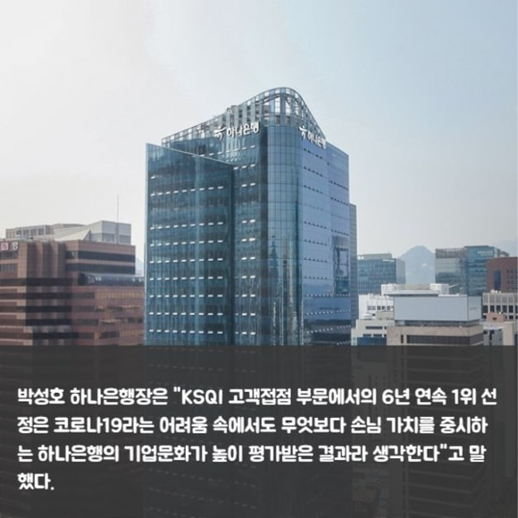 [프라임경제] 하나은행(은행장 박성호)은 한국능률협회컨설팅(KMAC) 주관 '2021년 한국산업 서비스품질지수(KSQI)' 고객접점 부문에서 6년 연속 은행산업 1위에 선정됐다고 21일 밝혔다.