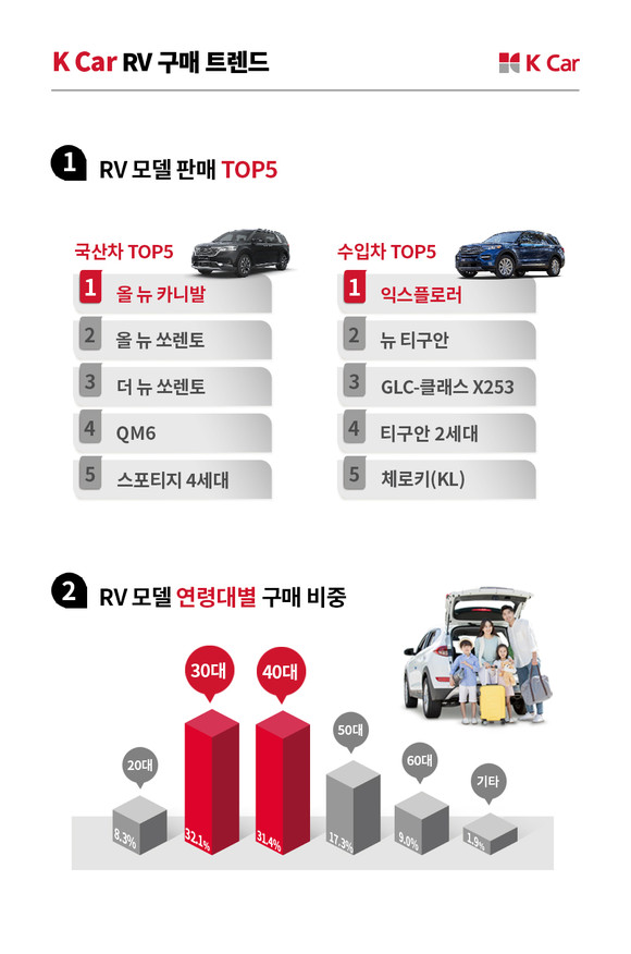 올해 2분기 케이카 직영점 및 내차사기 홈서비스를 통해 판매된 차량 데이터를 분석한 결과 케이카 전체 판매 차량 중 RV 판매비중은 29.5%로, 3대 중 1대에 육박하는 것으로 나타났다. 지난해 같은 기간과 비교해 SUV와 미니밴 등 RV 판매량이 31% 증가했다.
