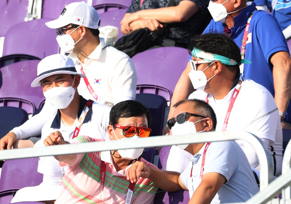 정의선 현대차그룹 회장이 지난 25일 일본 유메노시마 공원 양궁장에서 열린 도쿄올림픽 여자 양궁 단체전에서 양궁 여자 대표팀이 금메달을 획득하자 박수를 치고 있다. ⓒ 연합뉴스