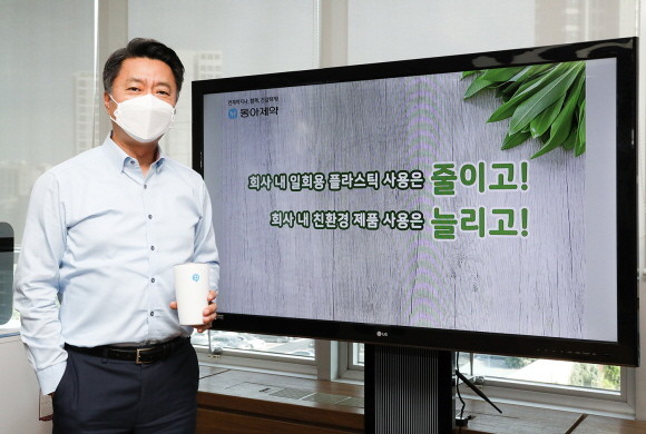 최호진 동아제약 사장이 생활 속 플라스틱 줄이기 실천 확산을 위한 '고고챌린지'에 동참했다. © 동아제약