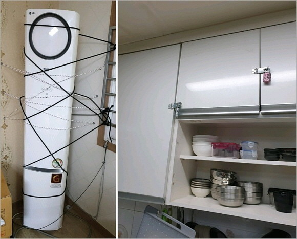 굵은 끈으로 묶인 에어컨, 자물쇠가 달린 찬장. 발달장애아를 돌보고 있는 집안의 모습이다. 폭력성이 나타나거나 감정 통제가 안 될 경우 물건을 부수거나 부모에게 폭력을 행사하기도 한다.