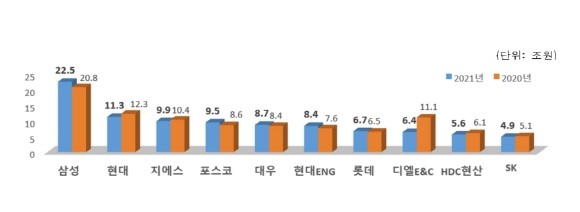 한편 업종별 공사 실적 순위를 보면 토목건축 △현대건설 7조3209억원 △삼성물산 6조6924억원 △대우건설(047040) 6조3016억원이다.
