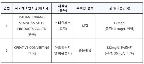 식약처는 식품을 꿰는데 사용하는 꼬지 1건은 니켈규격, 일회용 접시 1건은 총용출량(아크릴수지의 용출규격 항목) 규격을 초과해 수입통관 단계에서 차단하는 등 사전에 유통되지 않도록 조치했으며 향후 동일 제품이 수입되는 경우 정밀검사(5회)를 실시해 안전성 확인 절차를 더욱 강화할 예정이다.