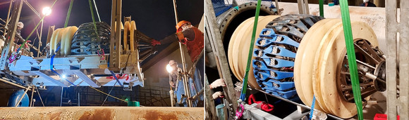 SK에너지 울산CLX에서 해저배관 검사를 위해 No.2 부이 해저배관에 인텔리전트 피그를 하역(왼쪽) 및 투입(오른쪽) 하고 있다. ⓒ SK에너지