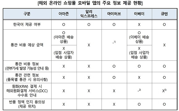 아마존의 경우 PC 웹사이트에서는 결제 단계에서 결제 통화(달러, 원화 등)를 선택할 수 있었으나, 모바일 앱에는 해당 기능이 없었다. 또한, 아마존과 알리익스프레스의 PC 웹사이트에서는 구매 과정 중 구체적인 반품 조건 정보가 제공됐으나 모바일 앱에서는 제공되지 않았다.