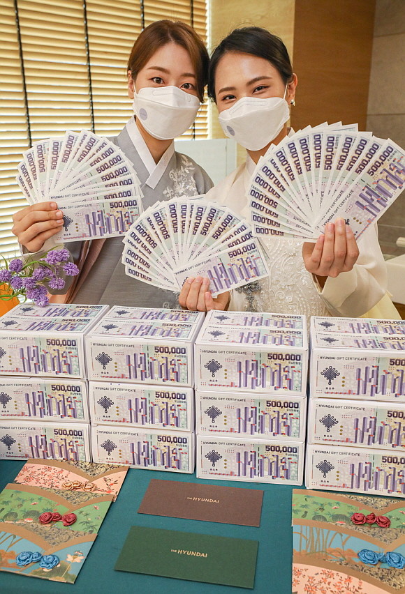 [프라임경제] 현대백화점(069960)은 2021년 추석을 앞두고 다음달 20일까지 전국 16개 점포에서 추석 상품권 패키지를 판매한다고 19일 밝혔다. 해당 기간 현대백화점 상품권을 30만원 이상 구매하는 고객에게 신사임당 고서화를 그려 넣은 고급 봉투(3종 중 택 1)를 증정하고, 200만원 이상 구매하는 경우 구매 금액대별 사은품을 제공한다.
