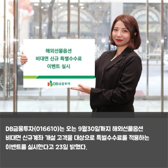 [프라임경제] DB금융투자(016610)는 오는 9월30일까지 해외선물옵션 비대면 신규계좌 개설 고객을 대상으로 특별수수료를 적용하는 이벤트를 실시한다고 23일 밝혔다.