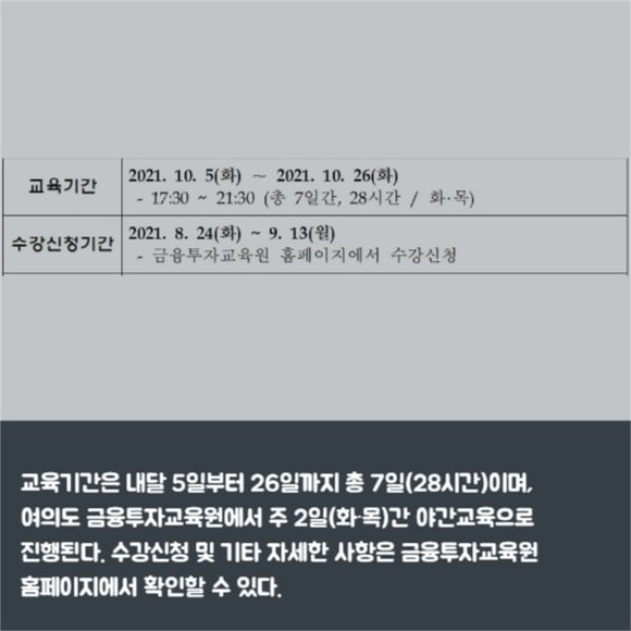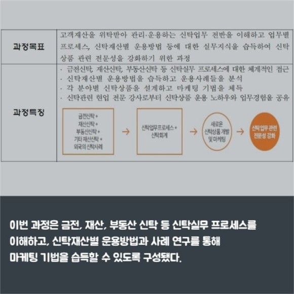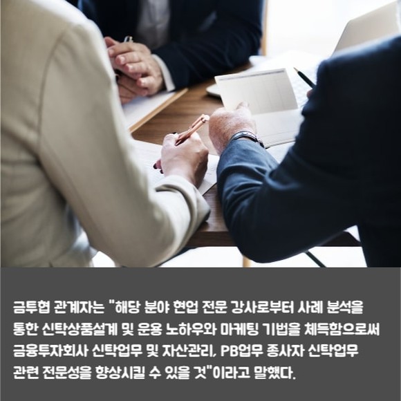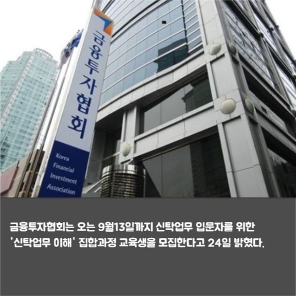 [프라임경제] 금융투자협회는 오는 9월13일까지 신탁업무 입문자를 위한 '신탁업무 이해' 집합과정 교육생을 모집한다고 24일 밝혔다.