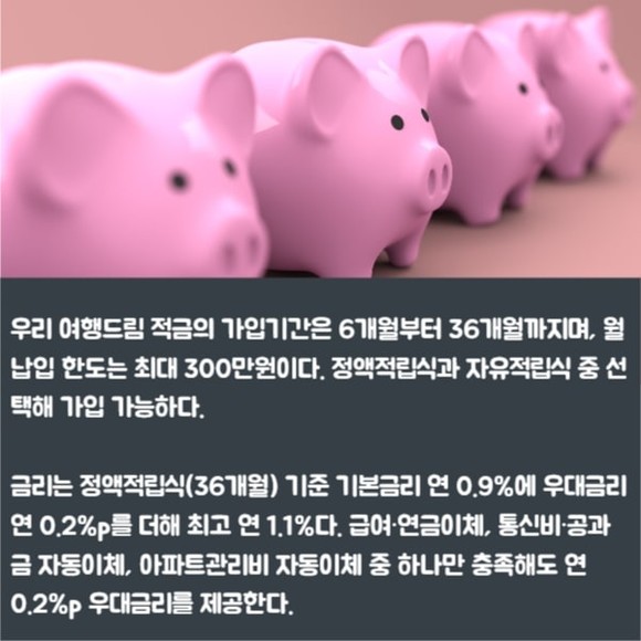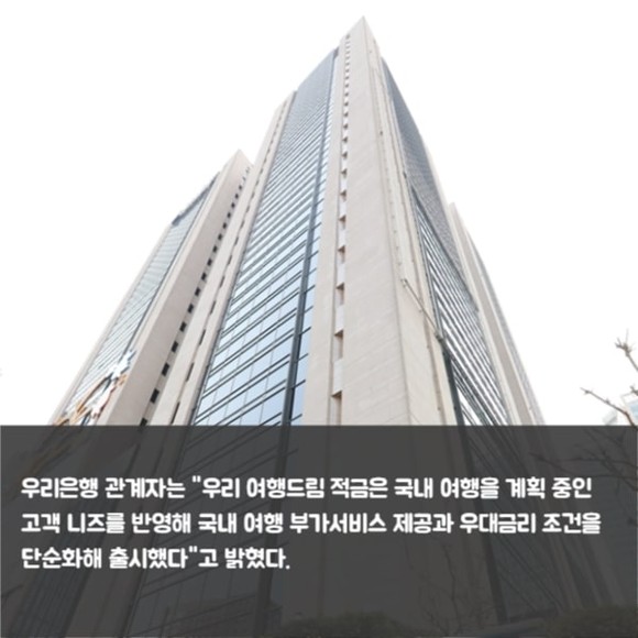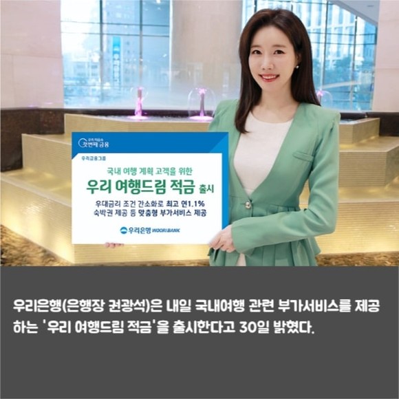 [프라임경제] 우리은행(은행장 권광석)은 내일 국내여행 관련 부가서비스를 제공하는 '우리 여행드림 적금'을 출시한다고 30일 밝혔다.