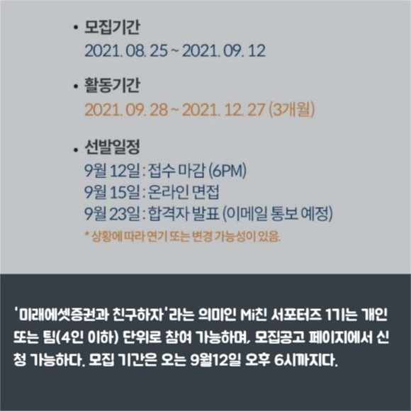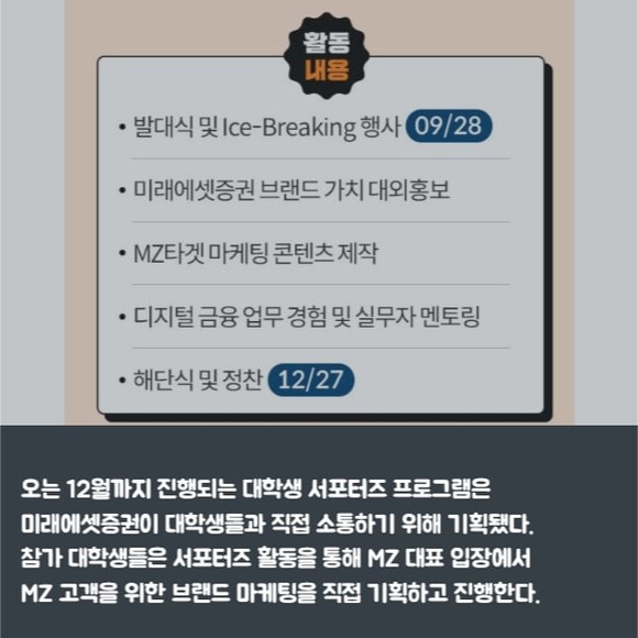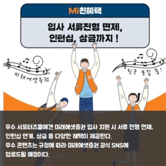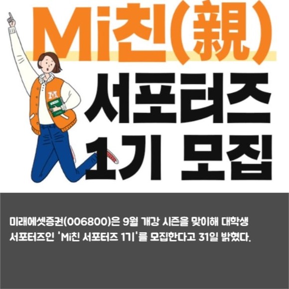 [프라임경제] 미래에셋증권(006800)은 9월 개강 시즌을 맞이해 대학생 서포터즈인 'Mi친 서포터즈 1기'를 모집한다고 31일 밝혔다.