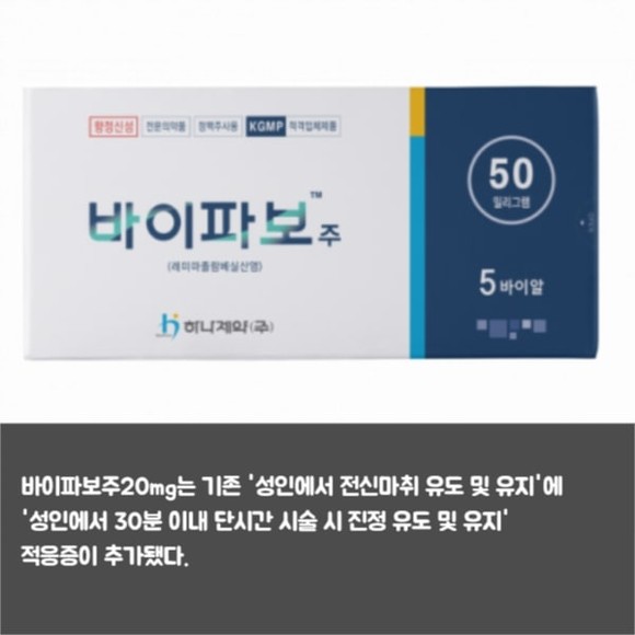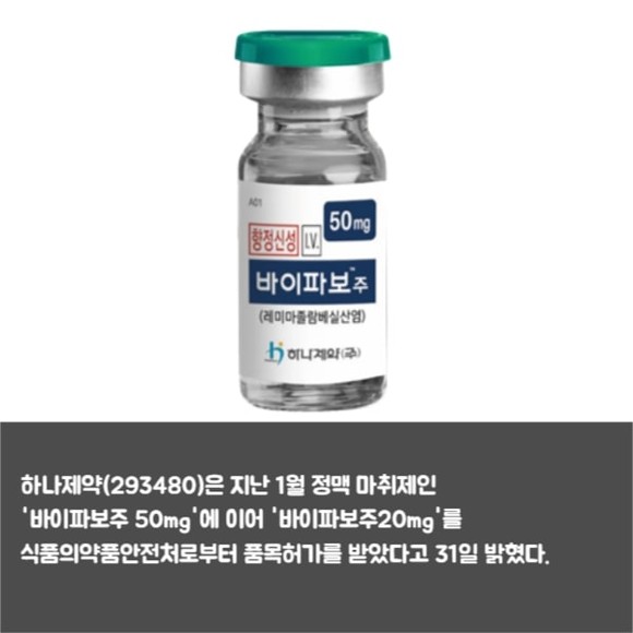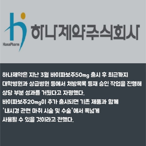 [프라임경제] 하나제약(293480)은 지난 1월 정맥 마취제 '바이파보주 50mg'에 이어 '바이파보주20mg'를 식품의약품안전처로부터 품목허가를 받았다고 31일 밝혔다.