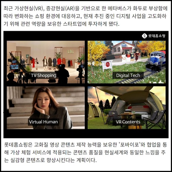 [프라임경제] 롯데홈쇼핑은 메타버스 사업 강화의 일환으로 실감형 영상 콘텐츠 제작 스타트업 포바이포에 30억원을 직접 투자하고 디지털 전환을 가속화한다.