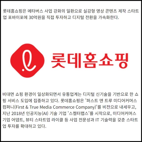 비대면 쇼핑 환경이 일상화되면서 유통업계는 디지털 신기술을 기반으로 한 쇼핑 서비스 도입에 집중하고 있다. 롯데홈쇼핑은 '퍼스트 앤 트루 미디어커머스 컴퍼니(First & True Media Commerce Company)'를 비전으로 내세우고, 지난 2018년 인공지능(AI) 기술 기업 '스켈터랩스'를 시작으로, 미디어커머스 기업 어댑트, 뷰티 스타트업 라이클 등 사업 전문성과 IT 기술력을 갖춘 스타트업 투자를 확대하고 있다.