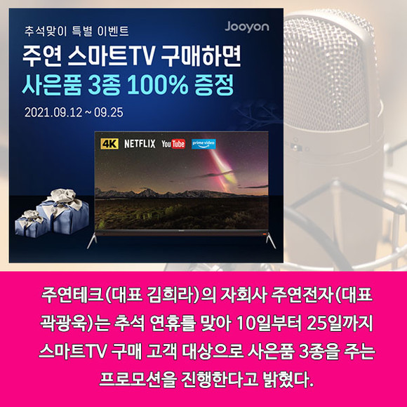 [프라임경제] 주연테크의 자회사 주연전자가 추석 연휴를 맞아 10일부터 스마트TV 구매 고객 대상으로 사은품 3종을 주는 프로모션을 진행한다고 밝혔다.