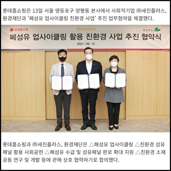 [프라임경제] 롯데홈쇼핑은 13일 서울 영등포구 양평동 본사에서 사회적기업 ㈜세진플러스, 환경재단과 '폐섬유 업사이클링 친환경 사업' 추진 업무협약을 체결했다.