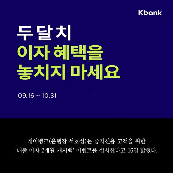 [프라임경제] 케이뱅크(은행장 서호성)는 중저신용 고객을 위한 '대출 이자 2개월 캐시백' 이벤트를 실시한다고 16일 밝혔다.
