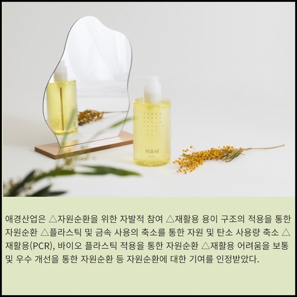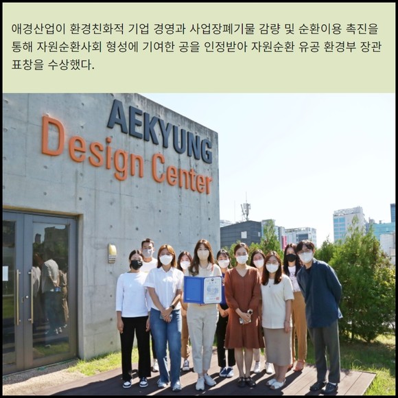애경산업은 환경친화적 기업 경영과 사업장폐기물 감량 및 순환이용 촉진을 통해 자원순환사회 형성에 기여한 공을 인정받아 자원순환 유공 환경부 장관 표창을 수상했다.