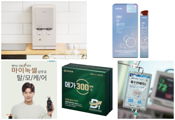 (왼쪽부터 시계방향) 현대렌탈케어 큐밍 더퓨어 알파 시리즈, 천호엔케어 태반 더 콜라겐, JW중외제약 플루엔페라주, 유한양행 고함량 활성 비타민 메가300정, 현대약품 마이녹셀. © 각 사