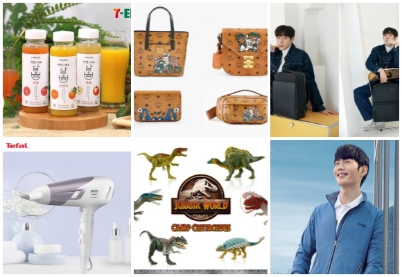 (왼쪽부터 시계방향) 세븐일레븐 세븐셀렉트 담음주스, MCM-아카 보쿠 협업 리미티드 에디션 캡슐 컬렉션, 쌤소나이트 레드 2021 F/W 컬렉션 론칭, 레드페이스 간절기 경량 재킷, 손오공 어택 액션 공룡 피규어 6종, 테팔 스튜디오 드라이 파워 2종. © 각 사