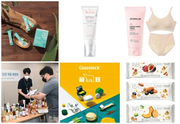 (왼쪽부터 시계방향) 김정문알로에 알랩 포스트바이오틱스 프리미엄, 아벤느 똘레랑스 컨트롤 크림, 아토팜 매터니티 케어 스트레치 마크 크림 세트, 올리브영 오!그래놀라바&영양볼 3종, SGC솔루션-곰표 협업 신제품 5종 출시, 홈플러스 전통주 상품 15종. © 각 사