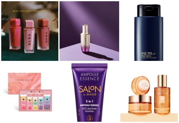(왼쪽부터 시계방향) 헤라 로즈 인퓨전 컬렉션, LG생활건강 예화담 환생고 앰플 에센스, 숨 디어옴므 퍼펙트 올인원 바디워시, 미샤 타임 레볼루션 프라임스템 100 3종, 애경산업 살롱드마지 실크 앰플 에센스·추석 선물세트 3종. © 각 사