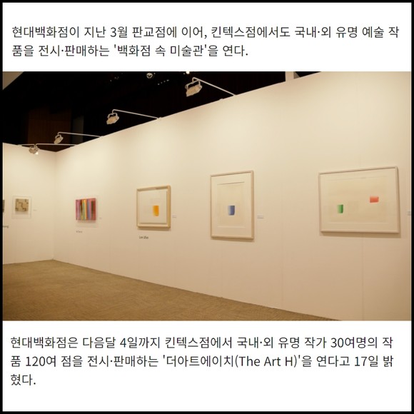 [프라임경제] 현대백화점은 다음달 4일까지 킨텍스점에서 국내·외 유명 작가 30여명의 작품 120여 점을 전시·판매하는 '더아트에이치(The Art H)'을 연다고 17일 밝혔다.