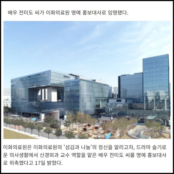 이화의료원은 이화의료원의 '섬김과 나눔'의 정신을 알리고자, 드라마 슬기로운 의사생활에서 신경외과 교수 역할을 맡은 배우 전미도 씨를 명예 홍보대사로 위촉했다고 17일 밝혔다.
