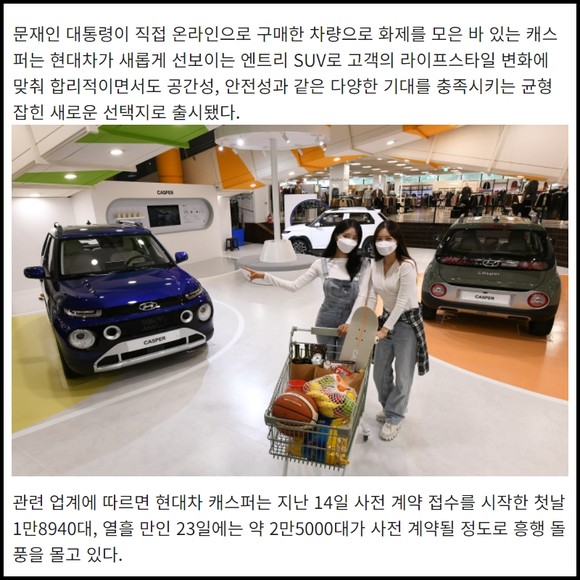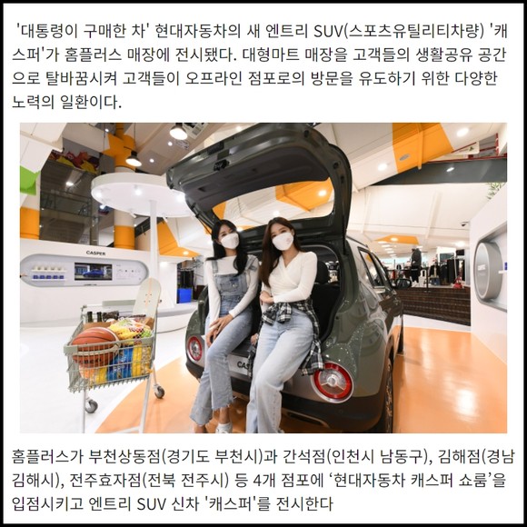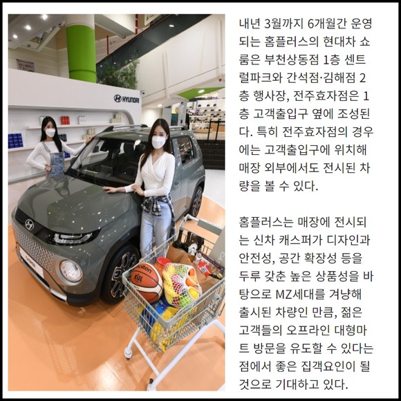 [프라임경제] '대통령이 구매한 차' 현대자동차의 새 엔트리 SUV(스포츠유틸리티차량) '캐스퍼'가 홈플러스 매장에 전시됐다. 대형마트 매장을 고객들의 생활공유 공간으로 탈바꿈시켜 고객들이 오프라인 점포로의 방문을 유도하기 위한 다양한 노력의 일환이다.