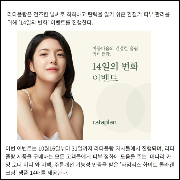 [프라임경제] 라타플랑은 건조한 날씨로 칙칙하고 탄력을 잃기 쉬운 환절기 피부 관리를 위해 '14일의 변화' 이벤트를 진행한다.