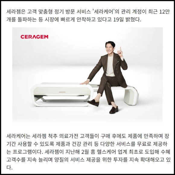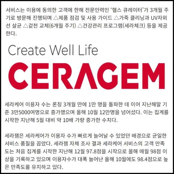 [프라임경제] 세라젬은 고객 맞춤형 정기 방문 서비스 '세라케어'의 관리 계정이 최근 12만 개를 돌파하는 등 시장에 빠르게 안착하고 있다고 19일 밝혔다.