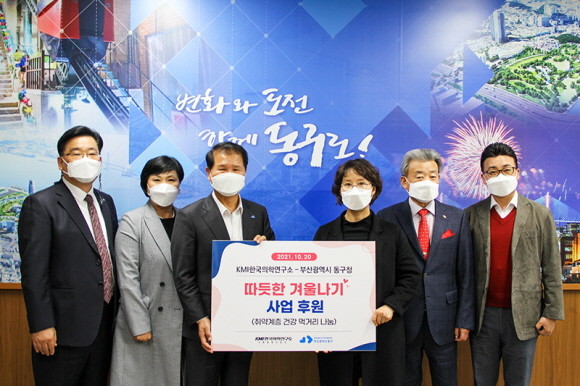 지난 20일 부산 동구청에서 진행된 '따뜻한 겨울나기 사업 후원 협약식'에는 최형욱 부산 동구청장, 김순이 KMI한국의학연구소 이사장, 한만진 KMI사회공헌사업단장, 홍운택 KMI부산검진센터장 등 관계자들이 참석했다.