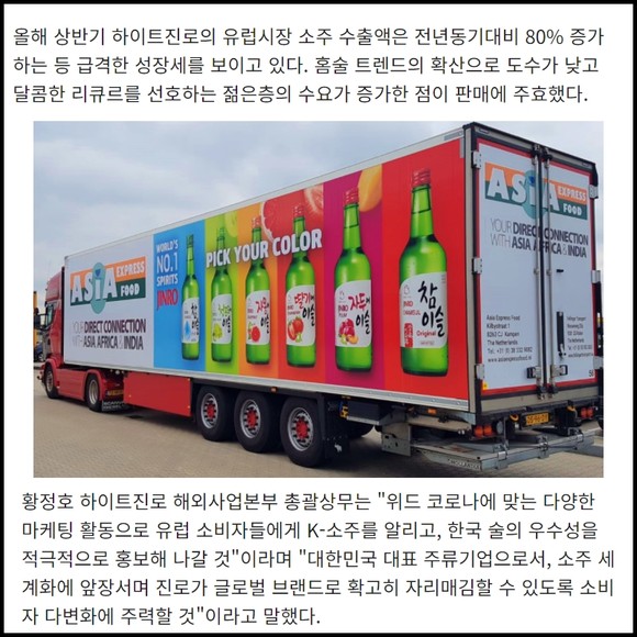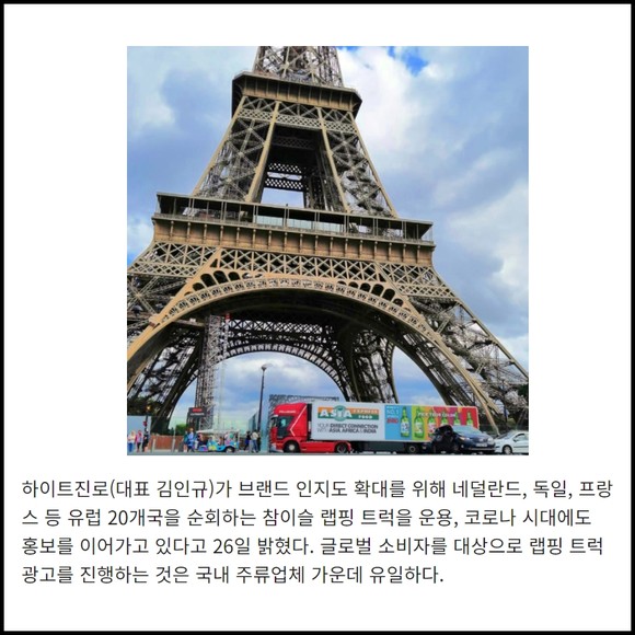 [프라임경제] 하이트진로(대표 김인규)가 브랜드 인지도 확대를 위해 네덜란드, 독일, 프랑스 등 유럽 20개국을 순회하는 참이슬 랩핑 트럭을 운용, 코로나 시대에도 홍보를 이어가고 있다고 26일 밝혔다. 글로벌 소비자를 대상으로 랩핑 트럭 광고를 진행하는 것은 국내 주류업체 가운데 유일하다.