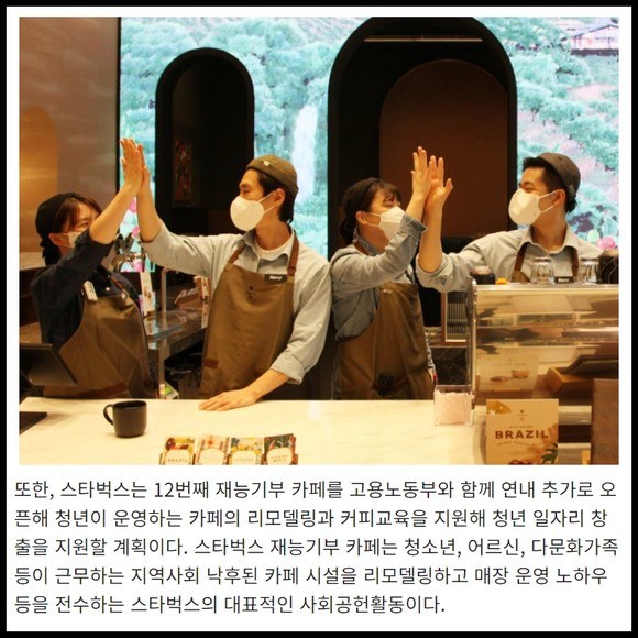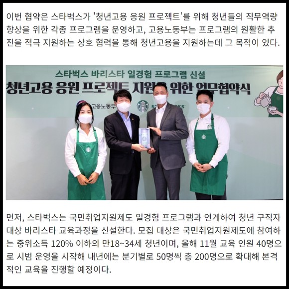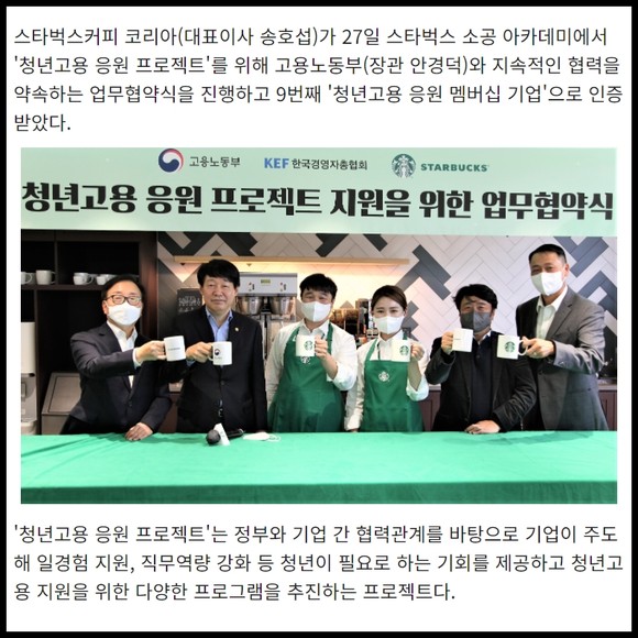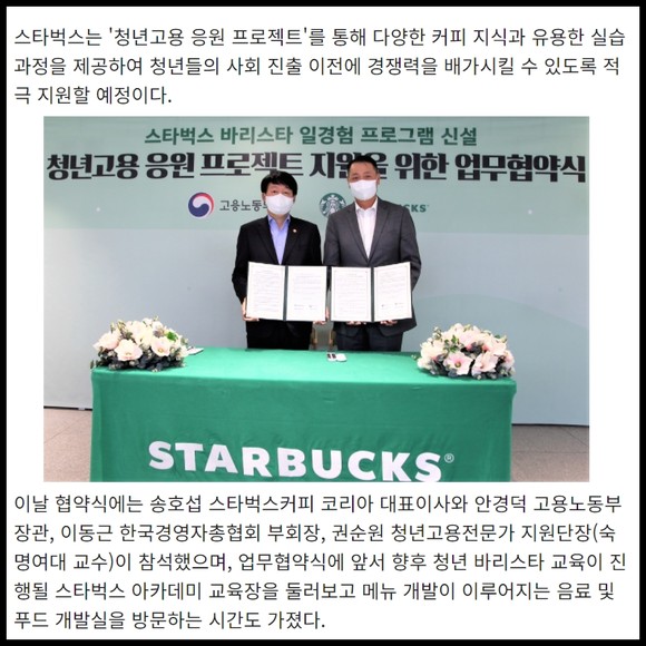 [프라임경제] 스타벅스커피 코리아(대표이사 송호섭)가 27일 스타벅스 소공 아카데미에서 '청년고용 응원 프로젝트'를 위해 고용노동부(장관 안경덕)와 지속적인 협력을 약속하는 업무협약식을 진행하고 9번째 '청년고용 응원 멤버십 기업'으로 인증 받았다.