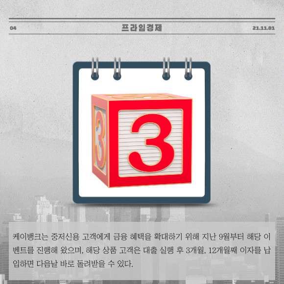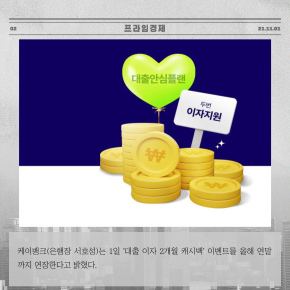 [프라임경제] 케이뱅크(은행장 서호성)는 1일 '대출 이자 2개월 캐시백' 이벤트를 올해 연말까지 연장한다고 밝혔다.