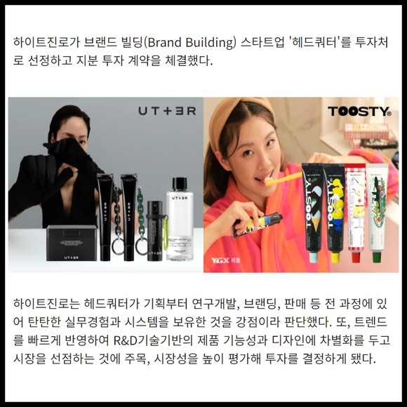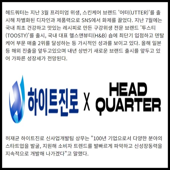 [프라임경제] 하이트진로가 브랜드 빌딩(Brand Building) 스타트업 '헤드쿼터'를 투자처로 선정하고 지분 투자 계약을 체결했다.