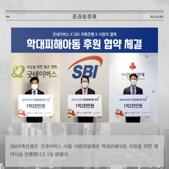 [프라임경제] SBI저축은행은 굿네이버스·서울 사랑의열매와 학대피해아동 지원을 위한 협약식을 진행했다고 1일 밝혔다.