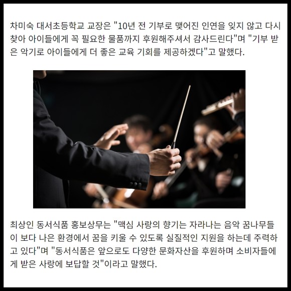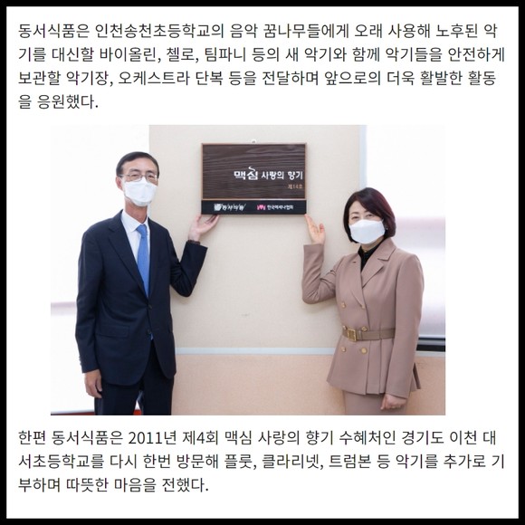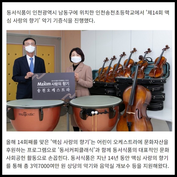 [프라임경제] 동서식품이 인천광역시 남동구에 위치한 인천송천초등학교에서 '제14회 맥심 사랑의 향기' 악기 기증식을 진행했다.