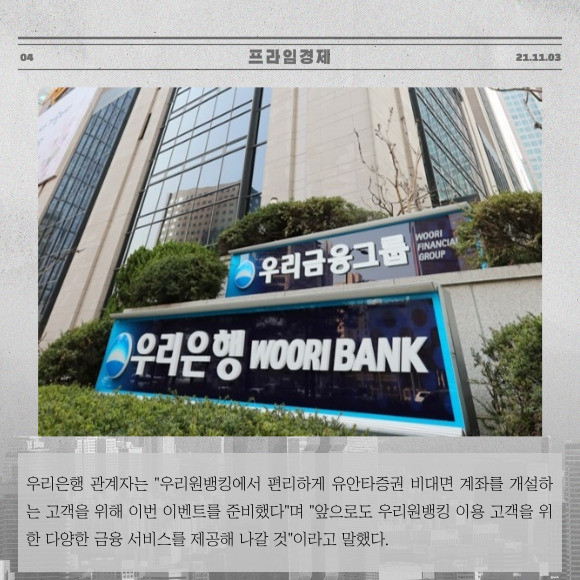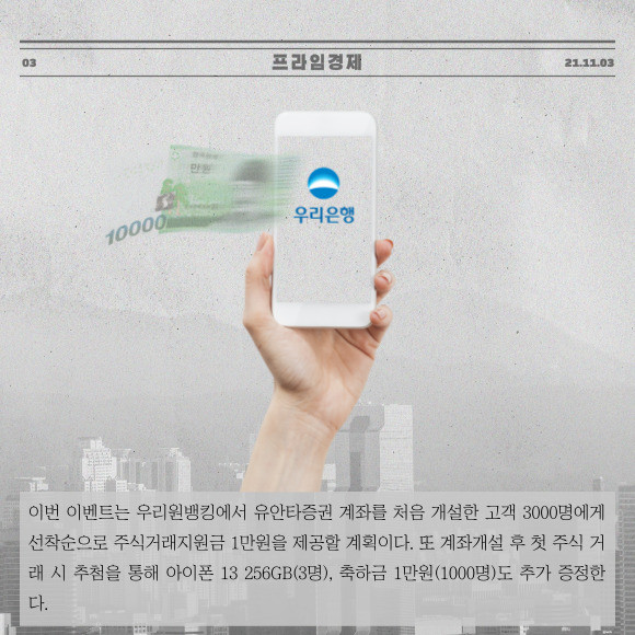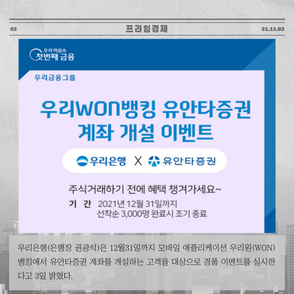 [프라임경제] 우리은행(은행장 권광석)은 12월31일까지 모바일 애플리케이션 우리원(WON)뱅킹에서 유안타증권 계좌를 개설하는 고객을 대상으로 경품 이벤트를 실시한다고 3일 밝혔다.