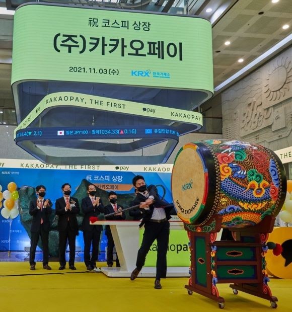 류영준 카카오페이 대표이사가 3일 한국거래소에서 타북을 치며, 코스피 상장식을 진행하고 있다. ⓒ 카카오페이