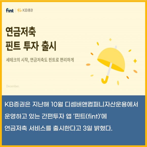 [프라임경제] KB증권은 지난해 10월 디셈버앤컴퍼니자산운용에서 운영하고 있는 간편투자 앱 '핀트(fint)'에 연금저축 서비스를 출시한다고 3일 밝혔다.