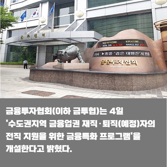 [프라임경제] 금융투자협회(이하 금투협)는 4일 '수도권지역 금융업권 재직·퇴직(예정)자의 전직 지원을 위한 금융특화 프로그램'을 개설한다고 밝혔다.
