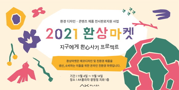 AK플라자가 광명시의 '광명업사이클아트센터'와 협업해 친환경 상품을 선보인다. AK플라자는 11월4일부터 11월14일까지 'AK플라자 광명점' 지하 1층에서 '2021 환상마켓 반짝매장' 팝업스토어를 진행한다고 밝혔다.