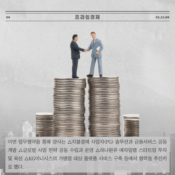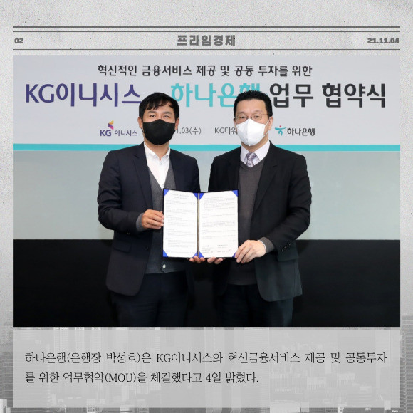 [프라임경제] 하나은행(은행장 박성호)은 KG이니시스와 혁신금융서비스 제공 및 공동투자를 위한 업무협약(MOU)을 체결했다고 4일 밝혔다.
