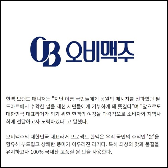 [프라임경제] 오비맥주의 '대한민국 대표라거 프로젝트' 한맥이 쌀 기부로 취약계층에게 응원의 마음을 전했다고 5일 밝혔다.