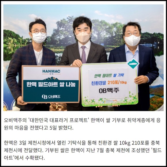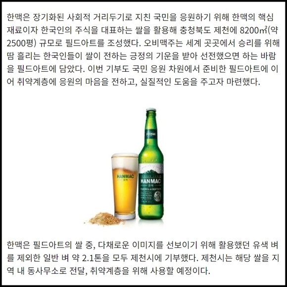 한맥은 3일 제천시청에서 열린 기탁식을 통해 친환경 쌀 10kg 210포를 충북 제천시에 전달했다. 기부된 쌀은 한맥이 지난 7월 충북 제천에 조성했던 '필드아트'에서 수확됐다.
