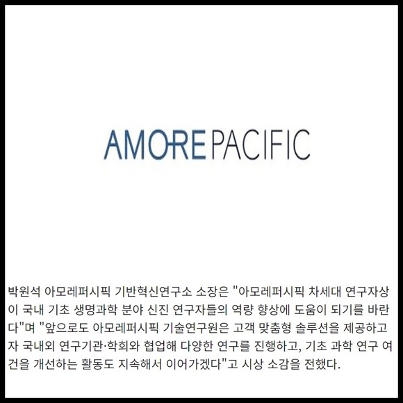 2015년 제정한 '아모레퍼시픽 차세대 연구자상'은 매년 국내 분자생물학과 세포생물학 분야 연구자를 다섯 명 선발해 총 1천만 원의 연구비를 지원한다. 대상자는 최근 1년간 해당 분야 연구성과를 발표한 논문의 제1저자인 박사급 이하 연구원과 석·박사 과정 대학원생이다. 학회 정회원의 추천을 받아 한국분자·세포생물학회가 심사해 수상자를 선정한다.